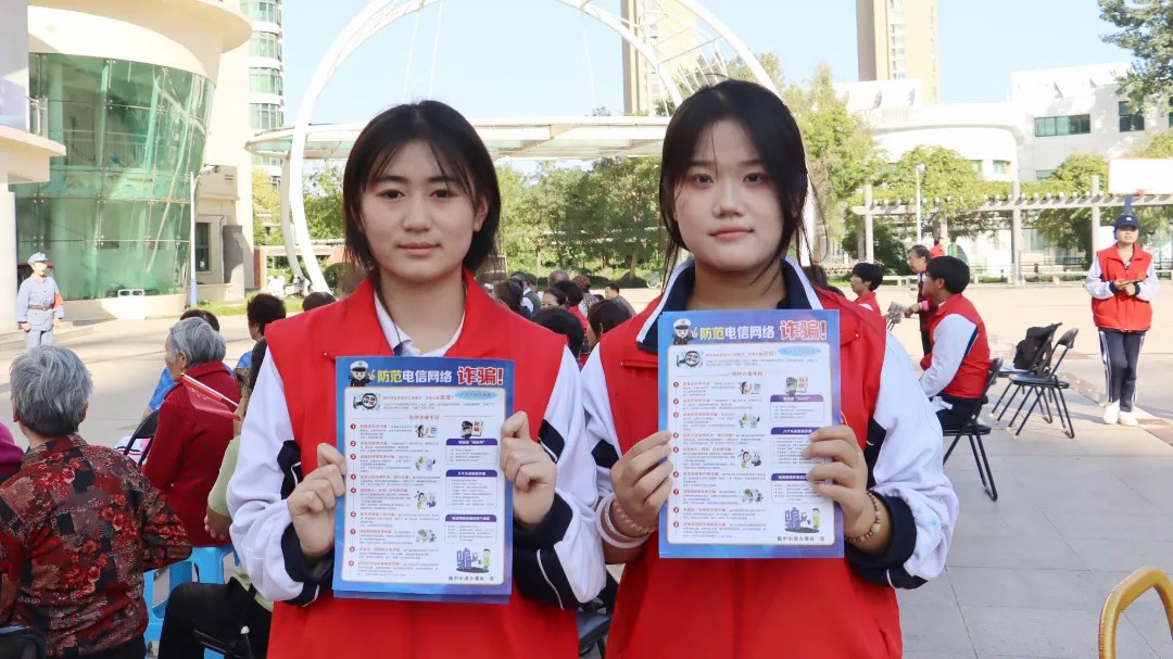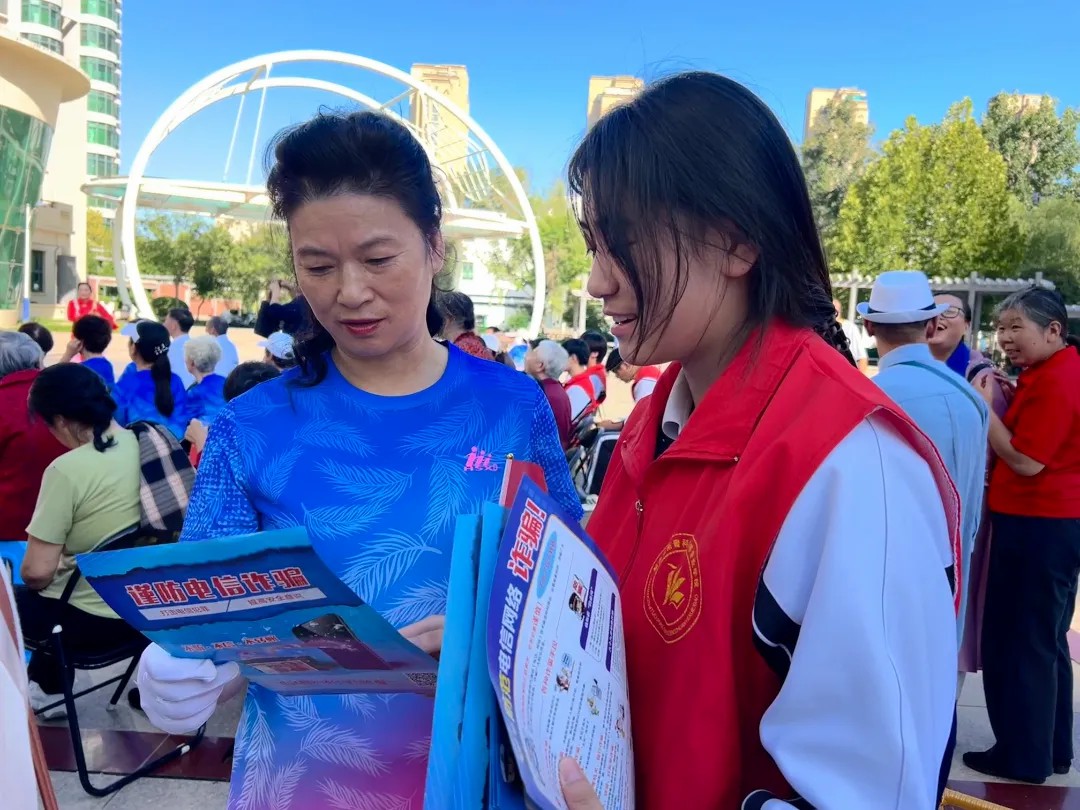 演出结束后,学生志愿者迅速化身“反诈宣传员”,发放反诈知识传单,手把手教社区居民辨别“陌生链接”“虚假客服”等陷阱,还反复强调“不轻易转账、不泄露个人信息”的防护要点。遇到年长的居民,志愿者们更是放慢语速、逐字解读,确保反诈知识真正入脑入心。