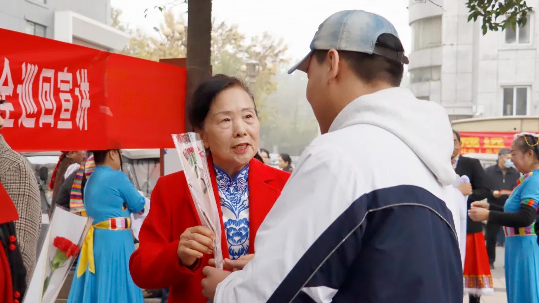 除文艺表演外,团员志愿者们还利用活动间隙主动参与社区重阳活动筹备工作,帮忙摆放座椅、协助社区组织游戏,向在场老人送上鲜花,以暖心举动传递节日祝福与关怀。