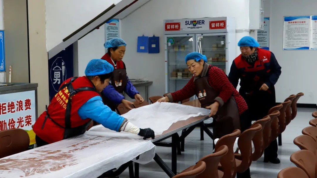 为营造温馨喜庆的活动氛围,学校早早开始了精心布置:洁净的桌布依次铺展,红火的欢迎条幅高高悬挂,每张操作台上,面片、馅料、工具皆分区摆放,井然有序。