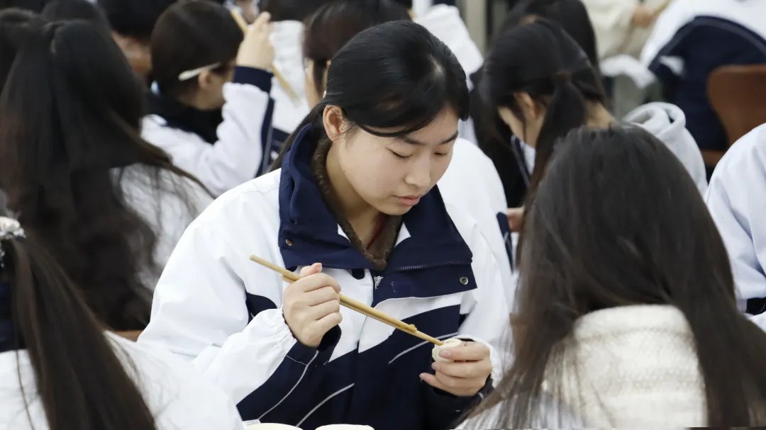 少了课堂的严肃,多了家的轻松。同学们全情投入,一边兴致勃勃地切磋着如何捏出褶皱匀称的元宝饺、月牙饺,一边分享着校园生活的趣事与冬至的温馨记忆。