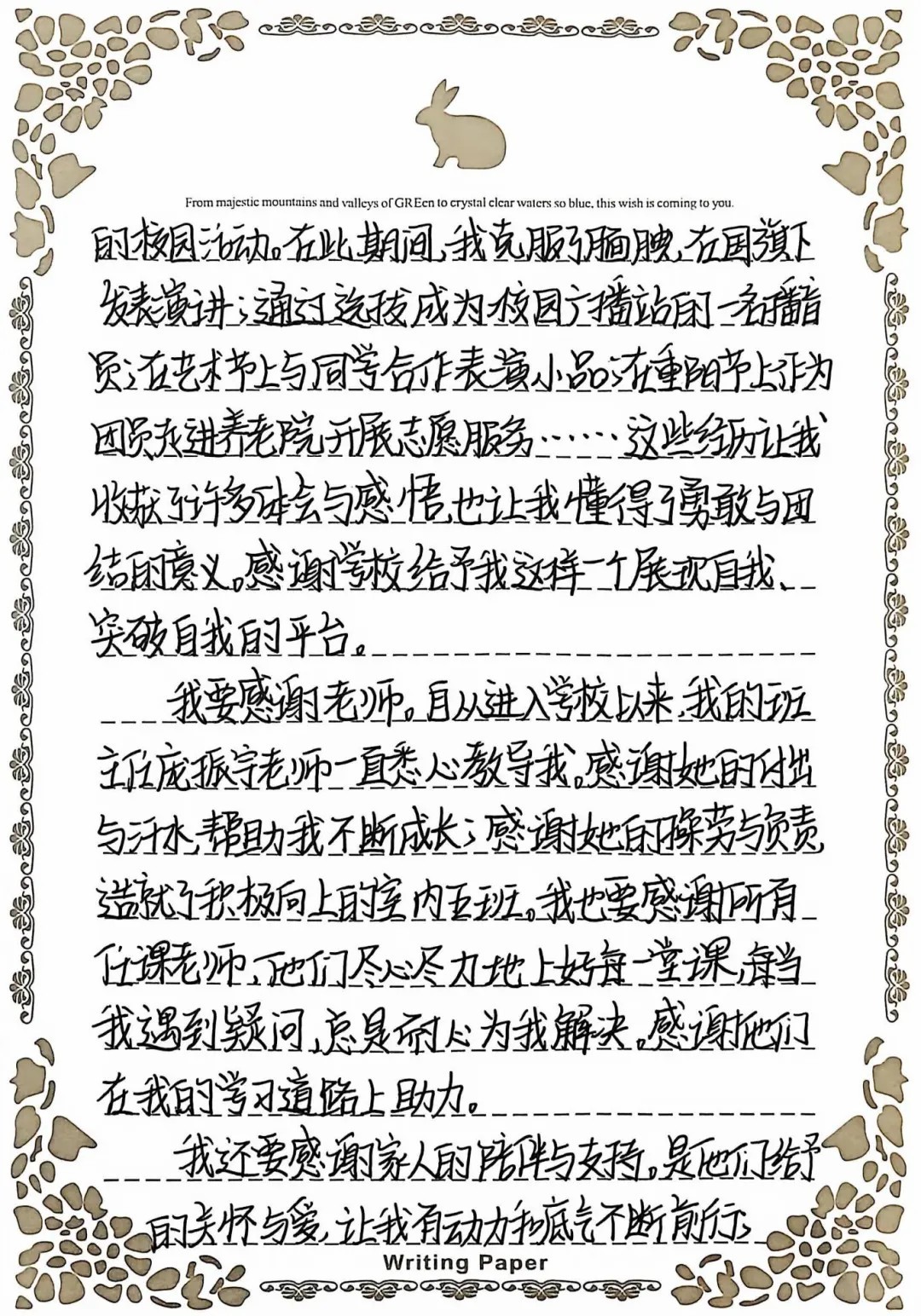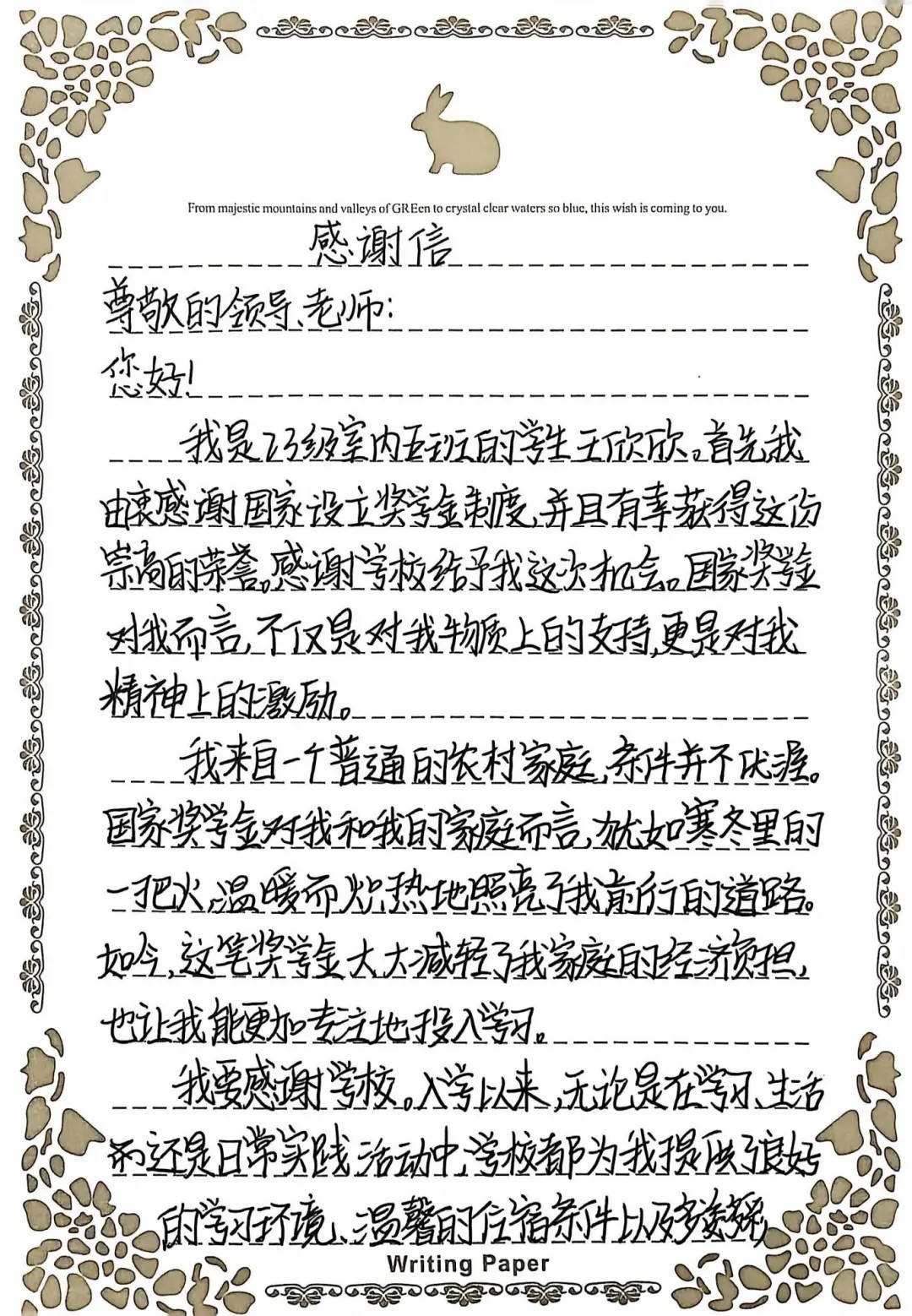 尤为动人的是,获奖学生王欣欣同学亲手书写了长达数页的感谢信。她在信中提到:“入学以来,学校为我提供了良好的学习环境、温馨的住宿条件以及多姿多彩的校园活动。我克服了腼腆,在国旗下发表演讲,通过选拔成为校园广播站的播音员,在艺术节上与同学合作表演小品,在重阳节走进养老院开展志愿服务......这些经历让我收获了许多体会与感悟,也让我懂得了勇敢与团结的意义。未来,我将带着这份荣誉,积极参与社会实践,努力成长为百用之才,回报社会、回报学校,不辜负厚望。”这封手写信,纸短情长,是学子心声最质朴、最动人的表达,也是学校育人成效最生动、最具体的体现。
